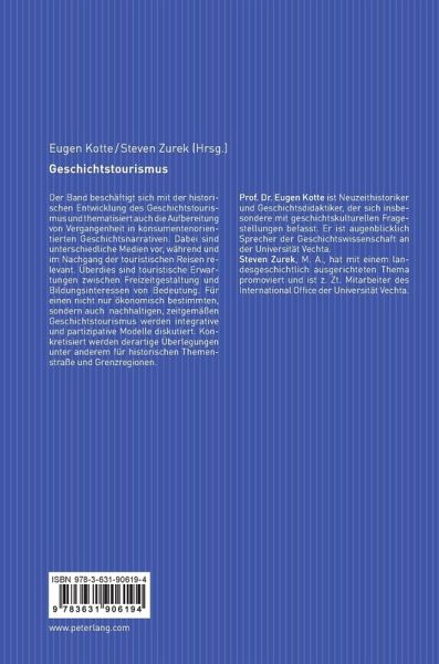 Der Band beschäftigt sich mit der historischen Entwicklung des Geschichtstourismus und thematisiert auch die Aufbereitung von Vergangenheit in konsumentenorientierten Geschichtsnarrativen. Dabei sind unterschiedliche Medien vor, während und im Nachgang der touristischen Reisen relevant. Überdies sind touristische Erwartungen zwischen Freizeitgestaltung und Bildungsinteressen von Bedeutung. Für einen nicht nur ökonomisch bestimmten, sondern auch nachhaltigen, zeitgemäßen Geschichtstourismus werden integrative und partizipative Modelle diskutiert. Konkretisiert werden derartige Überlegungen unter anderem für historischen Themenstraße und Grenzregionen.
