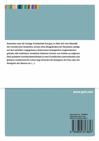 Bachelorarbeit aus dem Jahr 2013 im Fachbereich Soziologie - Beziehungen und Familie, Note: 2,0, Johannes Gutenberg-Universität Mainz, Sprache: Deutsch, Abstract: Betrachtet man die heutige Gesellschaft Europas, so lässt sich eine Binarität der Geschlechter feststellen, welche dem Alltagsdenken der Menschen zufolge auf den natürlich vorgegebenen dichotomen biologischen Gegebenheiten gründet. Alle Individuen westlicher Kulturen werden von Geburt an aufgrund ihrer primären Geschlechtsmerkmale in zwei Geschlechter unterschieden und gehören resultierend ihr Leben lang entweder der Kategorie der Frau oder der Kategorie des Mannes an. Diese selbstverständliche binäre Differenzierung, die ihren Ursprung in der Biologie findet, die es wiederum als ultimative Wahrheit anzusehen gilt, soll in dieser Arbeit in Frage gestellt werden. Es soll stattdessen aufgezeigt werden, dass die Geschlechtszugehörigkeit von den Gesellschaftsmitgliedern selbst konstruiert wird. Herangezogen werden dazu unter anderem zwei Phänomene, die die Grundüberzeugung der europäischen Gesellschaft herausfordern; die Intersexualität und die Transsexualität, wobei letztere sich seit Mitte des 20. Jahrhunderts in den westlichen Kulturen etablieren konnte (vgl. Hirschauer 1993: 9). Obwohl in westlichen Gesellschaften die Theorie der Zweigeschlechtlichkeit, also eine biologisch fundierte, dichotome Unterscheidung von Mann und Frau, fest in ihrem Alltagsdenken verankert ist, soll in dieser Arbeit anhand des Hermaphroditismus und einer Transsexuellen-Studie gezeigt werden, dass die binäre Differenzierung von Geschlecht sowie das Geschlecht selbst lediglich ein soziales Konstrukt der Gesellschaft ist.Thematisiert werden: die Alltagstheorie der Zweigeschlechtlichkeit, die konstruktivistische Sichtweise der sozialen Konstruktion von Geschlecht, das Verhältnis von Biologie und Kultur bei der Geschlechterdifferenzierung, das Konzept des "doing gender", Beispiele der Inter- und Transsexualität und die Handhabung dessen in anderen Kulturen, die Aneignung von Geschlecht sowie die Omnirelevanz des Geschlechts.