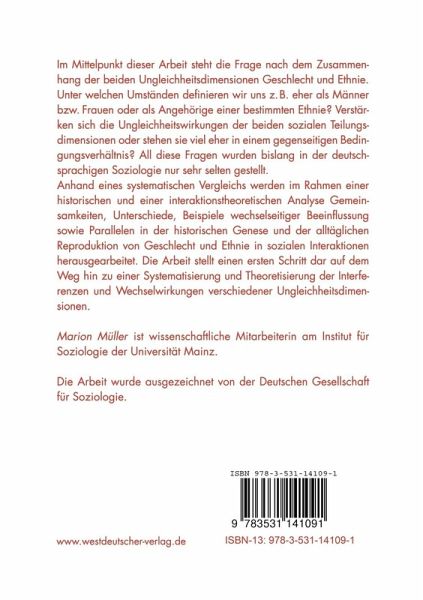 Anhand eines systematischen Vergleichs werden im Rahmen einer historischen und einer interaktionstheoretischen Analyse Gemeinsamkeiten, Unterschiede, Beispiele wechselseitiger Beeinflussung sowie Parallelen in der historischen Genese und der alltäglichen Reproduktion von Geschlecht und Ethnie in sozialen Interaktionen herausgearbeitet. Die Arbeit stellt einen ersten Schritt dar auf dem Weg hin zu einer Systematisierung und Theoretisierung der Interferenzen und Wechselwirkungen verschiedenerUngleichheitsdimensionen.