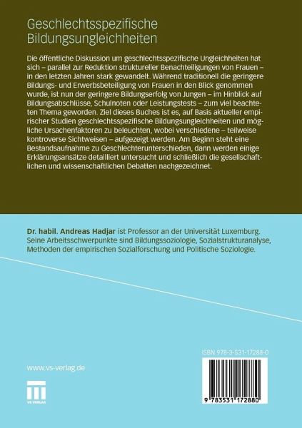 Die öffentliche Diskussion um geschlechtsspezifische Ungleichheiten hat sich - parallel zur Reduktion struktureller Benachteiligungen von Frauen - in den letzten Jahren stark gewandelt. Während traditionell die geringere Bildungs- und Erwerbsbeteiligung von Frauen in den Blick genommen wurde, ist nun der geringere Bildungserfolg von Jungen - im Hinblick auf Bildungsabschlüsse, Schulnoten oder Leistungstests - zum viel beachteten Thema geworden. Ziel dieses Buches ist es, auf Basis aktueller empirischer Studien geschlechtsspezifische Bildungsungleichheiten und mögliche Ursachenfaktoren zu beleuchten, wobei verschiedene - teilweise kontroverse Sichtweisen - aufgezeigt werden. Am Beginn steht eine Bestandsaufnahme zu Geschlechterunterschieden, dann werden einige Erklärungsansätze detailliert untersucht und schließlich die gesellschaftlichen und wissenschaftlichen Debatten nachgezeichnet.