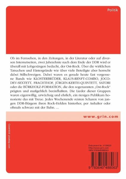 Fachbuch aus dem Jahr 2009 im Fachbereich Politik - Politische Systeme - Historisches, , Sprache: Deutsch, Abstract: Ob im Fernsehen, in den Zeitungen, in der Literatur oder auf diversen Internetseiten, zwei Jahrzehnte nach dem Ende der DDR wird er überall mit Lobgesängen bedacht, der Ost-Rock. Über die wirklichen Tatsachen und Hintergründe wie über viele Beteiligte aber herrscht dabei Stillschweigen. Dabei waren es gerade heute fast vergessene Bands wie KLOSTERBRÜDER, KLAUS-RENFT-COMBO, JOCO-DEV-SEXTETT, FRACHTHOF, JÜRGEN-KERTH-QUINTETT, SATORI oder die BÜRKHOLZ-FORMATION, die den sogenannten "Ost-Rock" prägten und maßgeblich beeinflußten. Die Lieder dieser Gruppen waren eigenwillig, urwüchsig und ehrlich, ein riesiges Publikum honorierte das mit Treue. Jedes Wochenende reisten Scharen von jungen DDR-Bürgern ihren Rock-Helden hinterher, per Anhalter oder oftmals schwarz mit der Bahn. Doch gerade als so etwas wie eine Szene im Entstehen begriffen war, schlugen die staatlichen Behörden zu. Es hagelte Abmahnungen, Auflagen, Spielverbote und Lizenz-Entzüge für die Bands. Fans wurden kriminalisiert und zu Staatsfeinden erklärt.Unter dem Druck der Behörden spaltete sich die Rockszene: Gruppen wie TEAM 4, PUHDYS, KARAT oder CITY arrangierten sich mit der Staatsmacht - bei Fernsehauftritten wurden lange Haare hochgebunden, auf Wunsch der Behörden Gruppennamen geändert. Als Gegenleistung durften diese Bands Platten bei der staatlichen Firma Amiga oder sogar bei westlichen Labels produzieren, im Fernsehen auftreten und sogar ins kapitalistische Ausland reisen.Auch in den Hitparaden des DDR-Rundfunks, mangels einer Verkaufsrangliste der einzige Gradmesser für den Erfolg, belegten ihre Titel vordere Plätze. Eine wirkliche Konkurrenz hatten PUHDYS & Co spätestens nach der Ausbürgerung des Liedermachers Wolf Biermann nicht mehr zu fürchten, weil immer mehr Rockmusiker das Land entnervt Richtung Westen verließen. Die DDR blutete künstlerisch aus, die verbliebenen Gruppen badeten im eigenen Saft. Am Ende wurden die größten Stars von ihrem Publikum ignoriert oder sogar ausgepfiffen wie 1988 auf der Freilichtbühne von Weißensee.Doch sie alle kamen wieder, PUHDYS, KARAT und CITY. Nach dem Zusammenbruch der DDR wurden aus den Staatsrockern die Erbverwalter des "Ost-Rock", denen die Fans nun plötzlich wieder zujubelten.
