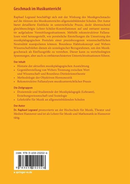 Raphael Legrand beschäftigt sich mit der Wirkung des Musikgeschmacks auf die Akteure des Musikunterrichts allgemeinbildender Schulen. Der Autor bietet detaillierte Einblicke in unterrichtliche Praxis, deckt überraschend gleichberechtigte Lehrer-Schüler-Konstellationen auf und enttarnt normativ aufgeladene Vermittlungssituationen. Mithilfe rekonstruktiver Fallanalysen wird herausgestellt, wie persönliche Einstellungen die Umsetzung des musikpädagogischen Postulats einer praxisbezogenen wissenschaftlichen Neutralität manipulieren können. Bourdieus Habituskonzept und Webers Wissenschaftslehre dienen als soziologischer Bezugsrahmen, um den Musikgeschmack als Einflussgröße zu verstehen. Dieser kann zu wertebedingten Spannungen, aber auch zu enthierarchisierten Unterrichtssituationen führen.