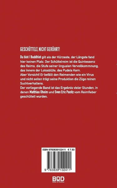 »Du bist/Buddhist« gilt als der Kürzeste, der Längste fand hier keinen Platz. Der Schüttelreim ist die Quintessenz des Reims, die Stufe seiner lingualen Vervollkommnung, das Innere der Lotusblume, des Pudels Kern.Aber Vorsicht! Er befällt den Reimenden wie ein Virus und nicht selten trägt seine Produktion die Züge reinen Suchtverhaltens.Der vorliegende Band ist das Ergebnis vieler Stunden, in denen Matthias Oheim und Sven Eric Panitz vom Reimfieber geschüttelt wurden.Illustriert werden die hier gesammelten reinen Schüttler durch Zeichnungen von Mattias Oheim.