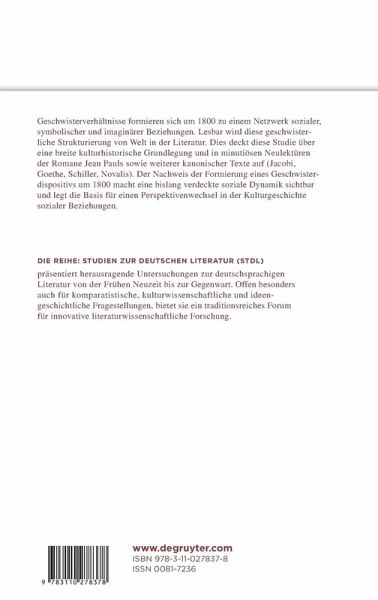 Around 1800, the idea of sibling relationships coalesced to form a network of social, symbolic, and imaginary relations. We can read this fraternal structuring of the world in the literature of the period. The present study examines the meaning of sibling relationships in a broader discussion of cultural history and with a meticulous new reading of the novels of Jean Paul along with other canonical texts (Jacobi, Goethe, Schiller, Novalis). The demonstration of how a dispositif related to siblings developed around 1800 uncovers a previously hidden social dynamic, offering the basis for a perspectival shift in the cultural history of social relationships.