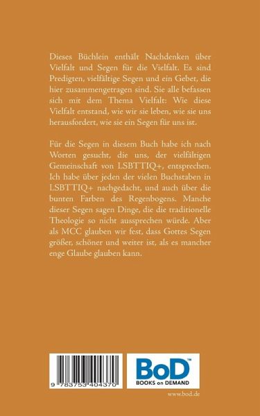 Dieses Büchlein enthält Nachdenken über Vielfalt und Segen für die Vielfalt. Es sind Predigten, vielfältige Segen und ein Gebet, die hier zusammengetragen sind. Sie alle befassen sich mit dem Thema Vielfalt: Wie diese Vielfalt entstand, wie wir sie leben, wie sie uns herausfordert, wie sie ein Segen für uns ist. Für die Segen in diesem Buch habe ich nach Worten gesucht, die uns, der vielfältigen Gemeinschaft von LSBTTIQ+, entsprechen. Ich habe über jeden der vielen Buchstaben in LSBTTIQ+ nachgedacht, und auch über die bunten Farben des Regenbogens. Manche dieser Segen sagen Dinge, die die traditionelle Theologie so nicht aussprechen würde. Aber als MCC glauben wir fest, dass Gottes Segen größer, schöner und weiter ist, als es mancher enge Glaube glauben kann.