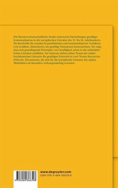 Die komparatistische Studie unternimmt es erstmalig, Geselligkeit als soziale und diskursive Praxis zu bestimmen, indem sie die sozialen Konstellationen und kommunikativen Verfahren beschreibt, die gesellige Situationen kennzeichnen. Sie zeigt, dass sich grundlegende Prinzipien geselliger Interaktion schon in der mittelalterlichen Literatur ausbilden und dann im Verlauf ihrer literarischen Geschichte je neu konfiguriert werden. Die zentrale These lautet, dass literarische Entwürfe von Geselligkeit nicht ohne spezifische Ordnungsmuster auskommen können. Diese zeigen sich im Bereich der sozialen Interaktion z.B. als gesellige Spielregeln ebenso wie in der narrativen und disputativen kommunikativen Praxis. Im Zentrum der Untersuchung stehen neben Beispielen aus der mhd. Artusepik (Hartmanns Iwein, Strickers Daniel, Heinrichs von dem Türlin Crône) vor allem zwei Texte Giovanni Boccaccios (der frühe Prosaroman Il Filocolo und das Decameron), an denen sich brennpunktartig Kontinuitäten und Brüche literarischer Geselligkeitsentwürfe zwischen Mittelalter und Früher Neuzeit aufzeigen lassen. Exemplarische Ausblicke auf die europäische Boccaccio-Rezeption schließen den Band ab. Die Studie leistet einen dezidiert literaturwissenschaftlichen Beitrag zur Erforschung vormoderner Kommunikationspraktiken, der den literarischen Charakter der geselligen Inszenierungen stets bewusst hält.