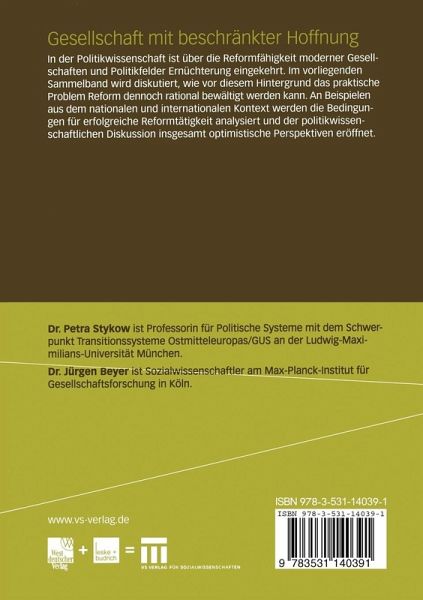 Vorwort.- Steuerung gesellschaftlichen Wandels: Utopie oder Möglichkeit?.- Steuerung gesellschaftlichen Wandels: Utopie oder Möglichkeit?.- I. Theoretische Dimensionen der Steuerung gesellschaftlicher Reformen.- Political Institutions and Social Power: Some Conceptual Explorations.- Kollektive Rationalität in sozialen Systemen.- II. Bedingungen und Ergebnisse erfolgreicher Reformen: Internationale Perspektiven.- Historische Pfadabhängigkeit oder Strategiewahl? Zur politischen Ökonomie postkommunistischer Wirtschaftsreform.- Verwaltungspolitische Strategie- und Politikwechsel im internationalen Vergleich: Zwischen Konvergenz und Divergenz.- Grenzen und Chancen sozialdemokratischer Politik im Handlungsraum Europa.- Erfolgsbedingungen des konfuzianischen Wohlfahrtskapitalismus: Kultursoziologische und modernisierungstheoretische Überlegungen.- Parties Matter! Parteipolitische Prägung und Reformprofile in den Beitrittsländern zur Europäischen Union.- Kultur als Transformationsbarriere: Entwicklungslinien einer Diskussion.- III. Die beschränkte Aussichtslosigkeit von Reformpolitik: Der Fall Deutschland.- Soziale Bewegungen und Reformpolitik.- Alterssicherungspolitik in Deutschland: Zwischen Kontinuität und Paradigmenwechsel.- Gewerkschaften als Akteure tripartistischer Austauschpolitik: "Bündnis für Arbeit, Ausbildung und Wettbewerbsfähigkeit".- Zehn Jahre "Public Management" - Lehren für die Reformfähigkeit öffentlicher Verwaltungen.- Wettbewerb als Reformpolitik: De- oder Re-Regulierung des deutschen Hochschulsystems?.- Die Autorinnen und Autoren.