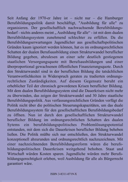 Seit Anfang der 1970er Jahre ist - nicht nur - die Hamburger Berufsbildungspolitik damit beschäftigt, 'Ausbildung für alle' zu organisieren. Der gesellschaftlich nachwachsende Berufsbildungsbedarf - nichts anderes meint 'Ausbildung für alle' - ist mit dem dualen Berufsbildungssystem zunehmend schlechter zu erfüllen. Da die Berufsbildungserwartungen Jugendlicher aus gesellschaftspolitischen Gründen kaum ignoriert werden können, hat es im ordnungsrechtlichen Schatten der dualen Berufsausbildung einen Strukturwandel beruflicher Bildung gegeben, abzulesen an einer sehr deutlich gestiegenen staatlichen Versorgungsquote mit Berufsausbildungen und einer überproportional gewachsenen öffentlichen Finanzierungsquote.