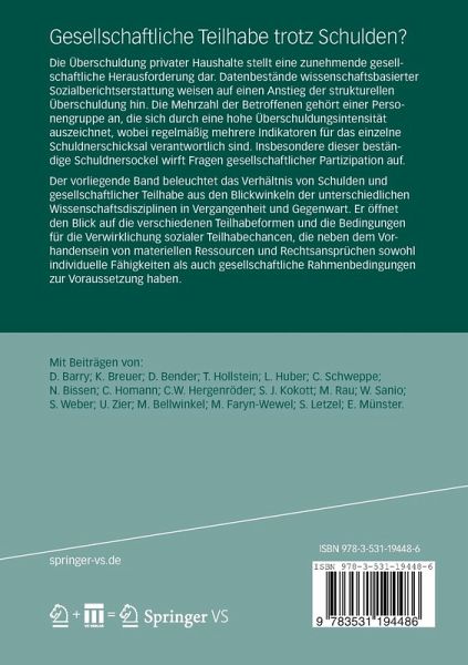 Dieser Band beleuchtet das Verhältnis von Schulden und gesellschaftlicher Teilhabe aus den Blickwinkeln der unterschiedlichen Wissenschaftsdisziplinen in Vergangenheit und Gegenwart. Er öffnet den Blick auf die verschiedenen Teilhabeformen und die Bedingungen für die Verwirklichung sozialer Teilhabechancen, die neben dem Vorhandensein von materiellen Ressourcen und Rechtsansprüchen sowohl individuelle Fähigkeiten als auch gesellschaftliche Rahmenbedingungen zur Voraussetzung haben.