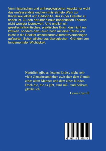 Gesellschaftskritik für Jedermann, so könnte man es wohl formulieren, was das Buch den Lesern zu bieten hat. Allerdings ein gesellschaftskritisches Buch mit dem Schwerpunktthema Kindersexualität und Pädophilie, welches aus vielerlei Perspektiven durchleuchtet wird, und dazu auch zahlreiche Erkenntnisse aus der Geschichte und Anthropologie mit einbringt. Auch anhand dieses Blickes in die Vergangenheit zu der Einsicht zu gelangen, dass man die ganze Menschheitsgeschichte hindurch ganz anders mit der Kindersexualität und Pädophilie umgegangen ist als bei uns heute üblich (und das gerade eben sogar in den kinderfreundlichsten Völkern, die uns bekannt sind), macht dieses Buch so lesenswert. Jenseits von moderner Verteuflungspropaganda und Hexenverfolgung gelangt der Leser auf diese Weise wieder zu einem ausgewogeneren Meinungsbild. Die Masse an Informationen, die das Buch auch zu jedem anderen der behandelten Themen aufbietet, kann sich wahrlich sehen lassen. Hier nur so viel: das Buch ist das Ergebnis eines jahrzehntelangen Freizeitengagements. Hinter diesem Werk stehen vierzig Jahre des Recherchierens, alleine das Schreiben des Manuskripts zog sich über acht Jahre hin. Unendlich viel Freizeit, zahllose Wochenenden, viele Urlaube sind dafür geopfert worden. Und aus dieser Menge an Berichten aus aller Welt im Kontext zu unserer wenig kinderfreundlichen, ja meist sogar regelrecht kinderfeindlichen und kinderschädigenden Umwelt bei uns heute ergeben sich in vielfacher Hinsicht ganz neue Schlussfolgerungen. Wenn es mit diesem Buch gelingen sollte, trotz vielfältiger Gefahren und Bedrohungen, mit denen sich die Heranwachsenden heute auf der Welt konfrontiert sehen (nicht zuletzt auch ökologischer Art!), den Kindern und Jugendlichen ein glücklicheres Leben zu ermöglichen und bessere Zukunftsperspektiven zu eröffnen, hat sich das Ziel des Autors erfüllt. Die Reaktionen der Leser werden zeigen, ob sich das jahrzehntelange Engagement gelohnt hat.
