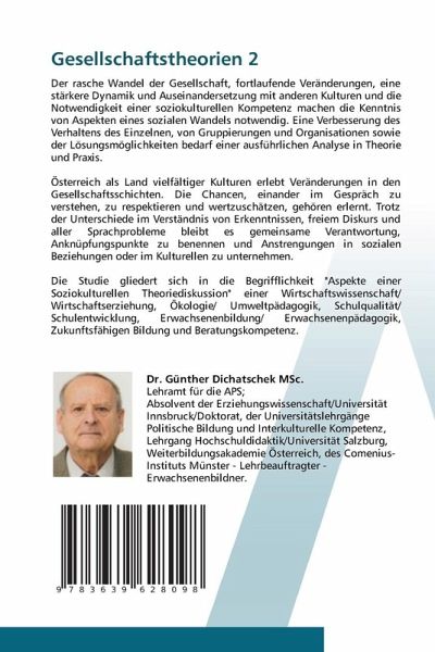 Der rasche Wandel der Gesellschaft, fortlaufende Veränderungen, eine stärkere Dynamik und Auseinandersetzung mit anderen Kulturen und die Notwendigkeit einer soziokulturellen Kompetenz machen die Kenntnis von Aspekten eines sozialen Wandels notwendig. Eine Verbesserung des Verhaltens des Einzelnen, von Gruppierungen und Organisationen sowie der Lösungsmöglichkeiten bedarf einer ausführlichen Analyse in Theorie und Praxis.Österreich als Land vielfältiger Kulturen erlebt Veränderungen in den Gesellschaftsschichten. Die Chancen, einander im Gespräch zu verstehen, zu respektieren und wertzuschätzen, gehören erlernt. Trotz der Unterschiede im Verständnis von Erkenntnissen, freiem Diskurs und aller Sprachprobleme bleibt es gemeinsame Verantwortung, Anknüpfungspunkte zu benennen und Anstrengungen in sozialen Beziehungen oder im Kulturellen zu unternehmen. Die Studie gliedert sich in die Begrifflichkeit "Aspekte einer Soziokulturellen Theoriediskussion" einer Wirtschaftswissenschaft/ Wirtschaftserziehung, Ökologie/ Umweltpädagogik, Schulqualität/ Schulentwicklung, Erwachsenenbildung/ Erwachsenenpädagogik, Zukunftsfähigen Bildung und Beratungskompetenz.