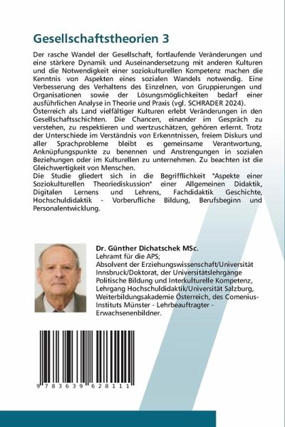 Der rasche Wandel der Gesellschaft, fortlaufende Veränderungen und eine stärkere Dynamik und Auseinandersetzung mit anderen Kulturen und die Notwendigkeit einer soziokulturellen Kompetenz machen die Kenntnis von Aspekten eines sozialen Wandels notwendig. Eine Verbesserung des Verhaltens des Einzelnen, von Gruppierungen und Organisationen sowie der Lösungsmöglichkeiten bedarf einer ausführlichen Analyse in Theorie und Praxis (vgl. SCHRADER 2024).Österreich als Land vielfältiger Kulturen erlebt Veränderungen in den Gesellschaftsschichten. Die Chancen, einander im Gespräch zu verstehen, zu respektieren und wertzuschätzen, gehören erlernt. Trotz der Unterschiede im Verständnis von Erkenntnissen, freiem Diskurs und aller Sprachprobleme bleibt es gemeinsame Verantwortung, Anknüpfungspunkte zu benennen und Anstrengungen in sozialen Beziehungen oder im Kulturellen zu unternehmen. Zu beachten ist die Gleichwertigkeit von Menschen.Die Studie gliedert sich in die Begrifflichkeit "Aspekte einer Soziokulturellen Theoriediskussion" einer Allgemeinen Didaktik, Digitalen Lernens und Lehrens, Fachdidaktik Geschichte, Hochschuldidaktik - Vorberufliche Bildung, Berufsbeginn und Personalentwicklung.