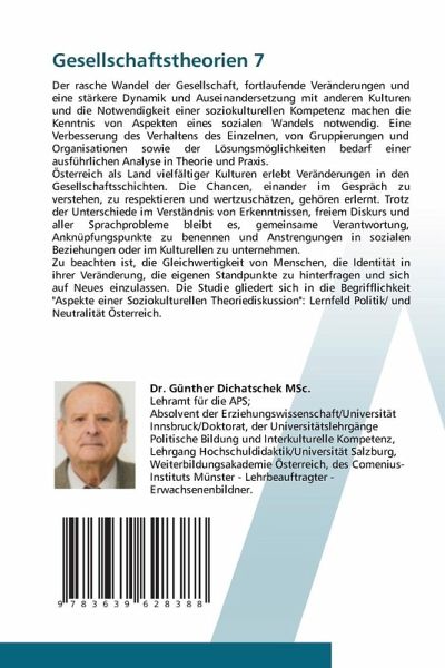 Der rasche Wandel der Gesellschaft, fortlaufende Veränderungen und eine stärkere Dynamik und Auseinandersetzung mit anderen Kulturen und die Notwendigkeit einer soziokulturellen Kompetenz machen die Kenntnis von Aspekten eines sozialen Wandels notwendig. Eine Verbesserung des Verhaltens des Einzelnen, von Gruppierungen und Organisationen sowie der Lösungsmöglichkeiten bedarf einer ausführlichen Analyse in Theorie und Praxis. Österreich als Land vielfältiger Kulturen erlebt Veränderungen in den Gesellschaftsschichten. Die Chancen, einander im Gespräch zu verstehen, zu respektieren und wertzuschätzen, gehören erlernt. Trotz der Unterschiede im Verständnis von Erkenntnissen, freiem Diskurs und aller Sprachprobleme bleibt es, gemeinsame Verantwortung, Anknüpfungspunkte zu benennen und Anstrengungen in sozialen Beziehungen oder im Kulturellen zu unternehmen.Zu beachten ist, die Gleichwertigkeit von Menschen, die Identität in ihrer Veränderung, die eigenen Standpunkte zu hinterfragen und sich auf Neues einzulassen. Die Studie gliedert sich in die Begrifflichkeit "Aspekte einer Soziokulturellen Theoriediskussion": Lernfeld Politik/ und Neutralität Österreich.