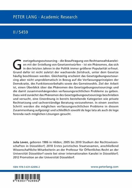 Gesetzgebungsoutsourcing - die Beauftragung von Rechtsanwaltskanzleien mit der Erstellung von Gesetzentwürfen - ist ein Phänomen, das sich in den letzten Jahren in der Politik immer größerer Popularität erfreut. Grund dafür ist nicht zuletzt der wachsende Zeitdruck, unter dem Gesetze häufig beschlossen werden. Gleichzeitig erscheint das Gesetzgebungsoutsourcing aber nicht unproblematisch in Bezug auf die Verfassungsprinzipien der Demokratie, des Funktionsvorbehalts sowie des Gemeinwohls. Ziel der Arbeit ist, einen Überblick über das Phänomen des Gesetzgebungsoutsourcings und die damit zusammenhängenden verfassungsrechtlichen Probleme zu geben. Dazu wird zunächst das Phänomen des Gesetzgebungsoutsourcings beschrieben und versucht, eine Einordnung in bereits bestehende Kategorien wie private Rechtsetzung und sachverständige Beratung vorzunehmen. In einem zweiten Schritt werden die möglichen verfassungsrechtlichen Probleme in diesem Zusammenhang aufgezeigt und schließlich sowohl de lege lata als auch de lege ferenda nach möglichen Lösungen gesucht.