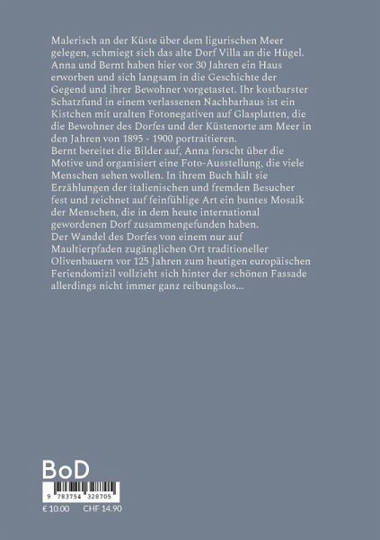 Malerisch an der Küste über dem ligurischen Meer gelegen, schmiegt sich das alte Dorf Villa an die Hügel. Anna und Bernt haben hier vor 30 Jahren ein Haus erworben und sich langsam in die Geschichte der Gegend und ihrer Bewohner vorgetastet. Ihr kostbarster Schatzfund in einem verlassenen Nachbarhaus ist ein Kistchen mit uralten Fotonegativen auf Glasplatten, die die Bewohner des Dorfes und der Küstenorte am Meer in den Jahren von 1895 - 1900 portraitieren. Bernt bereitet die Bilder auf, Anna forscht über die Motive und organisiert eine Foto-Ausstellung, die viele Menschen sehen wollen. In ihrem Buch hält sie Erzählungen der italienischen und fremden Besucher fest und zeichnet auf feinfühlige Art ein buntes Mosaik der Menschen, die in dem heute international gewordenen Dorf zusammengefunden haben.Der Wandel des Dorfes von einem nur auf Maultierpfaden zugänglichen Ort traditioneller Olivenbauern vor 125 Jahren zum heutigen europäischen Feriendomizil vollzieht sich hinter der schönen Fassade allerdings nicht immer ganz reibungslos...