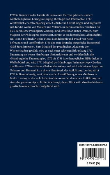 1729 in Kamenz in der Lausitz als Sohn eines Pfarrers geboren, studiert Gotthold Ephraim Lessing in Leipzig Theologie und Philosophie. 1747 veröffentlich er achtzehnjährig erste Gedichte und Erzählungen und begeistert sich für die Werke von Molière und Voltaire. In Berlin schreibt er Kritiken für die "Berlinische Privilegierte Zeitung" und schreibt an ersten Dramen. Zum Magister der Philosophie promoviert, nimmt er am literarischen Leben Berlins teil, ist mit Friedrich Nicolai, Moses Mendelssohn und Ewald von Kleist befreundet und veröffentlicht 1755 das erste deutsche bürgerliche Trauerspiel "Miß Sara Sampson". Zum Mitglied der preußischen Akademie der Wissenschaften gewählt, wird er nach einer schweren Erkrankung 1767 Dramaturg am neuen Hamburger Nationaltheater und veröffentlicht die "Hamburgische Dramaturgie". 1770 bis 1781 ist er herzoglicher Bibliothekar in Wolfenbüttel und wird 1771 Mitglied der Hamburger Freimaurerloge "Zu den drei Rosen". 1779 erscheint "Nathan der Weise" und wird mit seinem Appell an Toleranz und Humanität zu einem Hauptwerk der Aufklärung. Lessing stirbt 1781 in Braunschweig, zwei Jahre vor der Uraufführungseines "Nathan" in Berlin. Lessing ist der wohl bedeutendste Autor der deutschen Aufklärung und einer der ganze wenigen Dichter überhaupt, deren Werk seit Lebzeiten bis heute praktisch ununterbrochen aufgeführt wird.