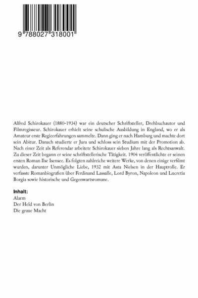 Alfred Schirokauer (1880-1934) war ein deutscher Schriftsteller, Drehbuchautor und Filmregisseur. Schirokauer erhielt seine schulische Ausbildung in England, wo er als Amateur erste Regieerfahrungen sammelte. Dann ging er nach Hamburg und machte dort sein Abitur. Danach studierte er Jura und schloss sein Studium mit der Promotion ab. Nach einer Zeit als Referendar arbeitete Schirokauer sieben Jahre lang als Rechtsanwalt. Zu dieser Zeit begann er seine schriftstellerische Tätigkeit. 1904 veröffentlichte er seinen ersten Roman Ilse Isensee. Es folgten zahlreiche weitere Werke, von denen einige verfilmt wurden, darunter Unmögliche Liebe, 1932 mit Asta Nielsen in der Hauptrolle. Er verfasste Romanbiografien über Ferdinand Lassalle, Lord Byron, Napoleon und Lucretia Borgia sowie historische und Gegenwartsromane. Inhalt: - Alarm - Der Held von Berlin - Die graue Macht