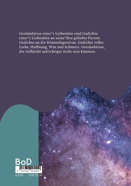 Geständnisse einer_s Liebenden sind Gedichte einer_s Liebenden an seine_ihre geliebte Person. Gedichte an die Himmelsgestirne. Gedichte voller Liebe, Hoffnung, Wut und Schmerz. Geständnisse, die nicht aufrichtiger sein könnten.
