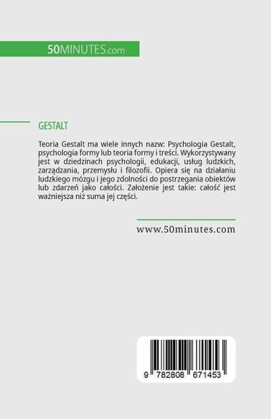 Teoria Gestalt ma wiele innych nazw: Psychologia Gestalt, psychologia formy lub teoria formy i tre¿ci. Wykorzystywany jest w dziedzinach psychologii, edukacji, us¿ug ludzkich, zarz¿dzania, przemys¿u i filozofii. Opiera si¿ na dziäaniu ludzkiego mózgu i jego zdolno¿ci do postrzegania obiektów lub zdarze¿ jako cäo¿ci. Zäo¿enie jest takie: cäo¿¿ jest wäniejsza ni¿ suma jej cz¿¿ci.