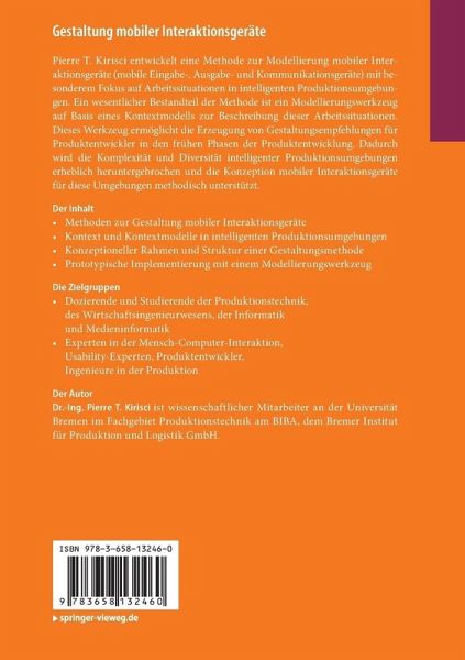 PierreT. Kirisci entwickelt eine Methode zur Modellierung mobiler Interaktionsgeräte(mobile Eingabe-, Ausgabe- und Kommunikationsgeräte) mit besonderem Fokus aufArbeitssituationen in intelligenten Produktionsumgebungen. Ein wesentlicherBestandteil der Methode ist ein Modellierungswerkzeug auf Basis einesKontextmodells zur Beschreibung dieser Arbeitssituationen. Dieses Werkzeugermöglicht die Erzeugung von Gestaltungsempfehlungen für Produktentwickler inden frühen Phasen der Produktentwicklung. Dadurch wird die Komplexität undDiversität intelligenter Produktionsumgebungen erheblich heruntergebrochen unddie Konzeption mobiler Interaktionsgeräte für diese Umgebungen methodischunterstützt.