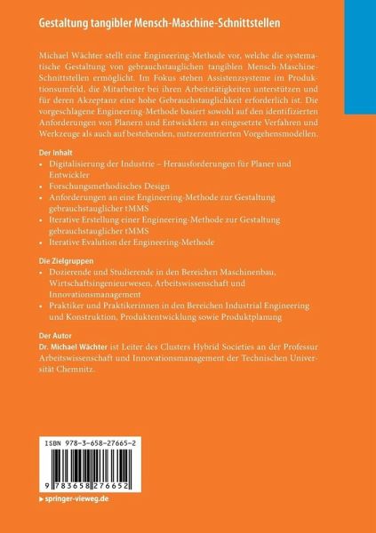 Michael Wächter stellt eine Engineering-Methode vor, welche die systematische Gestaltung von gebrauchstauglichen tangiblen Mensch-Maschine-Schnittstellen ermöglicht. Im Fokus stehen Assistenzsysteme im Produktionsumfeld, die Mitarbeiter bei ihren Arbeitstätigkeiten unterstützen und für deren Akzeptanz eine hohe Gebrauchstauglichkeit erforderlich ist. Die vorgeschlagene Engineering-Methode basiert sowohl auf den identifizierten Anforderungen von Planern und Entwicklern an eingesetzte Verfahren und Werkzeuge als auch auf bestehenden, nutzerzentrierten Vorgehensmodellen.