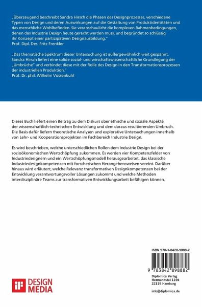 Im ersten Kapitel wird die Bedeutung von Umbrüchen für Wirtschaft und Gesellschaft beschrieben und dem Zweck der Wertschöpfung für die Menschen nachgegangen. In Kapitel zwei werden der Designbegriff, Designprozesse, die Funktionen industrieller Produkte und vier Kompetenzfelder von Industriedesignern erläutert. In Kapitel drei werden in zwei explorativen Untersuchungen die Rollen des Industrie Designs bei der soziokulturellen Wertschöpfung analysiert. Im vierten Kapitel wird ein Wertschöpfungsmodell herausgearbeitet, das klassische Industriedesignkompetenzen mit forscherischen Herangehensweisen vereint. Darüber hinaus wird erläutert, welche Relevanz transformativen Designkompetenzen zu Zeiten des Umbruchs zukommt und wie diese für die interdisziplinäre Projektarbeit genutzt werden können.