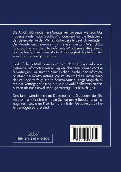 Habilitation Universität Frankfurt/Main 1996Die Attraktivität moderner Managementkonzepte wie Lean Management oder Total Quality Management hat die Bedeutung des Lieferanten in der Wertschöpfungskette deutlich verändert. Der Wandel des Lieferanten vom Teilefertiger zum Wertschöpfungspartner löst die alte Lieferanten-Produzenten-Beziehung ab, die häufig durch eine starke Abhängigkeit des Lieferanten vom Produzenten geprägt war. Heike Schenk-Mathes analysiert vor dem Hintergrund asymmetrischer Informationsverteilung verschiedene Formen von Lieferverträgen. Die Autorin berücksichtigt hierbei den Informationsstand der Kontrollinstanz, die im Streitfall die Durchsetzung der Verträge verfolgt. Heike Schenk-Mathes zeigt Möglichkeiten der Vertragsgestaltung auf, die sowohl Selbstwahlmechanismen als auch unvollständige Verträge berücksichtigen.