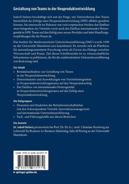 Isabell Sieberz beschäftigt sich mit der Frage, wie Unternehmen ihre Teams hinsichtlich des Erfolgs einer Neuproduktentwicklung (NPE) effektiv gestalten können. Sie untersucht im Rahmen von zwei empirischen Studien den Einfluss einer Integration des Vertriebs sowie auch den Einfluss internationaler Heterogenität in NPE-Teams auf den Erfolg eines neuen Produkts und leitet Handlungsempfehlungen für die Praxis ab. Das Institut für Marktorientierte Unternehmensführung (IMU) wurde 1999 an der Universität Mannheim neu konstituiert. Es versteht sich als Plattform für anwendungsorientierte Forschung sowie als Forum des Dialogs zwischen Wissenschaft und Praxis. Ziel dieser Schriftenreihe ist es, wissenschaftliche Erkenntnisse zu publizieren, die für die marktorientierte Unternehmensführung von Bedeutung sind.