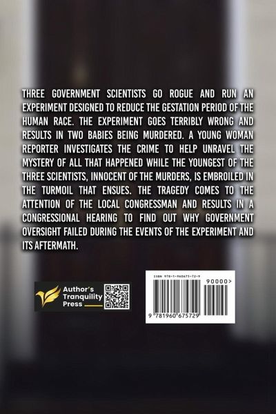 Three government scientists go rogue and run an experiment designed to reduce the gestation period of the human race. The experiment goes terribly wrong and results in two babies being murdered. A young woman reporter investigates the crime to help unravel the mystery of all that happened while the youngest of the three scientists, innocent of the murders, is embroiled in the turmoil that ensues. The tragedy comes to the attention of the local congressman and results in a congressional hearing to find out why government oversight failed during the events of the experiment and its aftermath.