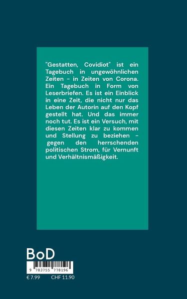 "Gestatten, Covidiot" ist ein Tagebuch in ungewöhnlichen Zeiten - in Zeiten von Corona. Ein Tagebuch in Form von Leserbriefen. Es ist ein Einblick in eine Zeit, die nicht nur das Leben der Autorin auf den Kopf gestellt hat. Und das immer noch tut. Es ist ein Versuch, mit diesen Zeiten klar zu kommen und Stellung zu beziehen - gegen den herrschenden politischen Strom, für Vernunft und Verhältnismäßigkeit.