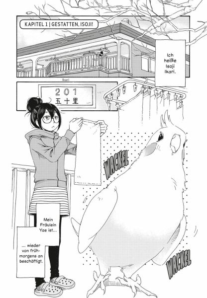 Für den neugierigen Nymphensittich Isoji ist jeder Tag ein Abenteuer. Ob sein Frauchen Yae das auch so sieht...? Aber klar! Die Zeichnerin liebt ihr quietschgelbes Haustier mit dem weichen Federkleid, den süßen roten Bäckchen und der frechen Federhaube. Der kleine Papagei hat bei der Entdeckung der Welt so manchen Unfug und Spaß im Kopf - bleibt dabei aber immer äußerst höflich.