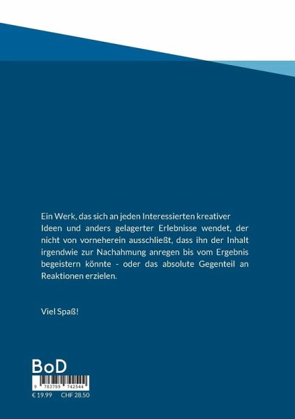 Ein Werk, das sich an jeden Interessierten kreativer Ideen und anders gelagerter Erlebnisse wendet, der nicht von vorneherein ausschließt, dass ihn der Inhalt irgendwie zur Nachahmung anregen bis vom Ergebnis begeistern könnte - oder das absolute Gegenteil an Reaktionen erzielen. Viel Spaß!
