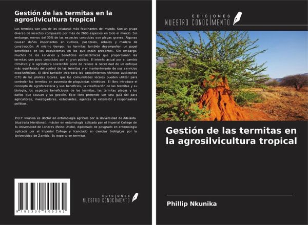 Las termitas son una de las criaturas más fascinantes del mundo. Son un grupo diverso de insectos compuesto por más de 2600 especies en todo el mundo. Sin embargo, menos del 30% de las especies conocidas son plagas graves. Algunas causan daños importantes en cultivos, pastizales, árboles y madera de construcción. Al mismo tiempo, las termitas también desempeñan un papel beneficioso en los ecosistemas en los que están presentes. Sin embargo, muchos de los servicios y beneficios ecosistémicos que proporcionan las termitas son poco conocidos por el gran público. El interés actual por el cambio climático y la agricultura sostenible pone de relieve la necesidad de un enfoque más equilibrado del control de las termitas y el mantenimiento de sus servicios ecosistémicos. El libro también incorpora los conocimientos técnicos autóctonos (CTI) de las plantas locales, que las comunidades locales pueden utilizar para controlar las termitas en ausencia de plaguicidas sintéticos. El libro introduce el concepto de agroforestería y sus beneficios, la clasificación de las termitas y su biología, los aspectos beneficiosos de las termitas, las termitas plagas y los daños que causan y su gestión. Este libro pretende ser una guía útil para agricultores, investigadores, estudiantes, agentes de extensión y responsables políticos.