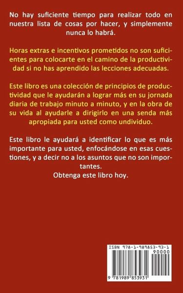 No hay suficiente tiempo para realizar todo en nuestra lista de cosas por hacer, y simplemente nunca lo habrá. Horas extras e incentivos prometidos no son suficientes para colocarte en el camino de la productividad si no has aprendido las lecciones adecuadas. Este libro es una colección de principios de productividad que le ayudarán a lograr más en su jornada diaria de trabajo minuto a minuto, y en la obra de su vida al ayudarle a dirigirlo en una senda más apropiada para usted como undividuo. Este libro le ayudará a identificar lo que es más importante para usted, enfocándose en esas cuestiones, y a decir no a los asuntos que no son importantes. Obtenga este libro hoy.