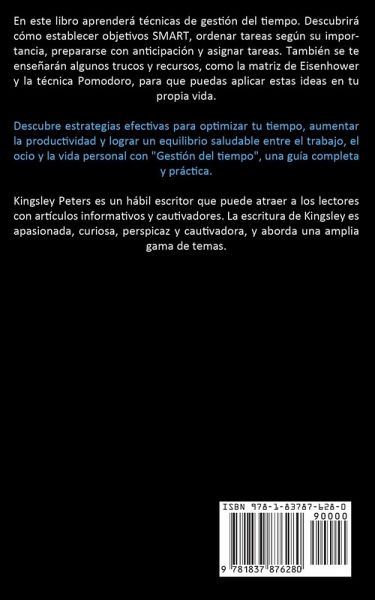 En este libro aprenderá técnicas de gestión del tiempo. Descubrirá cómo establecer objetivos SMART, ordenar tareas según su importancia, prepararse con anticipación y asignar tareas. También se te enseñarán algunos trucos y recursos, como la matriz de Eisenhower y la técnica Pomodoro, para que puedas aplicar estas ideas en tu propia vida. Descubre estrategias efectivas para optimizar tu tiempo, aumentar la productividad y lograr un equilibrio saludable entre el trabajo, el ocio y la vida personal con "Gestión del tiempo", una guía completa y práctica. Kingsley Peters es un hábil escritor que puede atraer a los lectores con artículos informativos y cautivadores. La escritura de Kingsley es apasionada, curiosa, perspicaz y cautivadora, y aborda una amplia gama de temas.