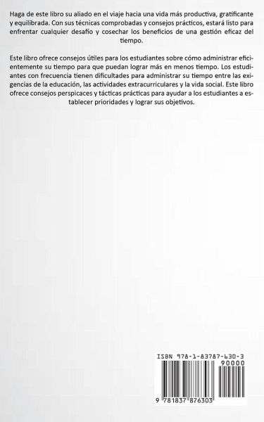 Haga de este libro su aliado en el viaje hacia una vida más productiva, gratificante y equilibrada. Con sus técnicas comprobadas y consejos prácticos, estará listo para enfrentar cualquier desafío y cosechar los beneficios de una gestión eficaz del tiempo. Este libro ofrece consejos útiles para los estudiantes sobre cómo administrar eficientemente su tiempo para que puedan lograr más en menos tiempo. Los estudiantes con frecuencia tienen dificultades para administrar su tiempo entre las exigencias de la educación, las actividades extracurriculares y la vida social. Este libro ofrece consejos perspicaces y tácticas prácticas para ayudar a los estudiantes a establecer prioridades y lograr sus objetivos.