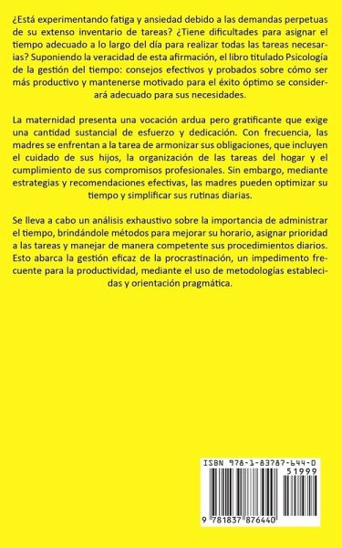 ¿Está experimentando fatiga y ansiedad debido a las demandas perpetuas de su extenso inventario de tareas? ¿Tiene dificultades para asignar el tiempo adecuado a lo largo del día para realizar todas las tareas necesarias? Suponiendo la veracidad de esta afirmación, el libro titulado Psicología de la gestión del tiempo: consejos efectivos y probados sobre cómo ser más productivo y mantenerse motivado para el éxito óptimo se considerará adecuado para sus necesidades. La maternidad presenta una vocación ardua pero gratificante que exige una cantidad sustancial de esfuerzo y dedicación. Con frecuencia, las madres se enfrentan a la tarea de armonizar sus obligaciones, que incluyen el cuidado de sus hijos, la organización de las tareas del hogar y el cumplimiento de sus compromisos profesionales. Sin embargo, mediante estrategias y recomendaciones efectivas, las madres pueden optimizar su tiempo y simplificar sus rutinas diarias. Se lleva a cabo un análisis exhaustivo sobre la importancia de administrar el tiempo, brindándole métodos para mejorar su horario, asignar prioridad a las tareas y manejar de manera competente sus procedimientos diarios. Esto abarca la gestión eficaz de la procrastinación, un impedimento frecuente para la productividad, mediante el uso de metodologías establecidas y orientación pragmática.