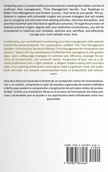 Embarking upon a transformative journey towards unlocking the hidden secrets of proficient time management, "Time Management Secrets: Your Roadmap to Better Time Management and Greater Success," shall serve as your guide. This audiobook is replete with actionable insights and proven strategies that will enable you to recognize and eliminate time-wasting activities, minimize distractions, and prioritize essential tasks that lead to significant outcomes. Through the provision of tailored practical insights aligned with your distinctive circumstances, you will be empowered to maximize your schedule, optimize your workflow, and effectively manage your most valuable asset, time. Furthermore, our commitment to enhancing your time management skills extends beyond the aforementioned. The compendium, entitled "The Time Management Solution: Unlocking the Secrets to Efficient Time Management for Productivity and Success," delves into the quintessence of effective time management with greater rigor. Learn cutting-edge strategies to optimize your efficiency, leverage the potency of concentration, and surmount inertia. Irrespective of your role as a devoted professional with a tight schedule, a diligent student coping with countless tasks, or an aspiring entrepreneur yearning to make a significant mark, this audiobook will steer you towards unprecedented levels of productivity and achievement. Esta obra literaria trasciende el ámbito de un compendio común de recomendaciones y, en cambio, comprende un plan de estudios organizado de manera metódica y táctica que acelera la comprensión y la aplicación de principios vitales de productividad. Facilita una orientación eficaz en el proceso de formulación de metas precisas y alcanzables que se ajusten a sus aspiraciones tanto individuales como ocupacionales.