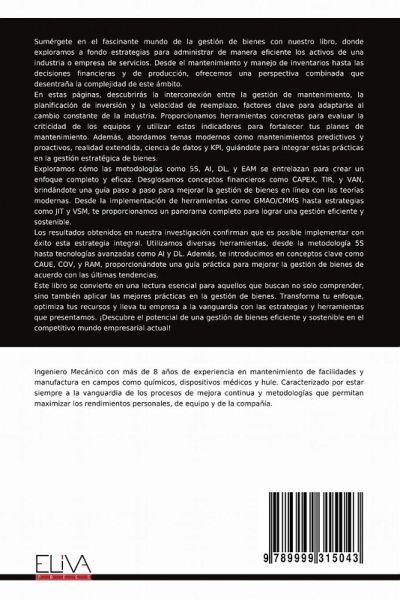 Sumérgete en el fascinante mundo de la gestión de bienes con nuestro libro, donde exploramos a fondo estrategias para administrar de manera eficiente los activos de una industria o empresa de servicios. Desde el mantenimiento y manejo de inventarios hasta las decisiones financieras y de producción, ofrecemos una perspectiva combinada que desentraña la complejidad de este ámbito. En estas páginas, descubrirás la interconexión entre la gestión de mantenimiento, la planificación de inversión y la velocidad de reemplazo, factores clave para adaptarse al cambio constante de la industria. Proporcionamos herramientas concretas para evaluar la criticidad de los equipos y utilizar estos indicadores para fortalecer tus planes de mantenimiento. Además, abordamos temas modernos como mantenimientos predictivos y proactivos, realidad extendida, ciencia de datos y KPI, guiándote para integrar estas prácticas en la gestión estratégica de bienes. Exploramos cómo las metodologías como 5S, AI, DL, y EAM se entrelazan para crear un enfoque completo y eficaz. Desglosamos conceptos financieros como CAPEX, TIR, y VAN, brindándote una guía paso a paso para mejorar la gestión de bienes en línea con las teorías modernas. Desde la implementación de herramientas como GMAO/CMMS hasta estrategias como JIT y VSM, te proporcionamos un panorama completo para lograr una gestión eficiente y sostenible. Los resultados obtenidos en nuestra investigación confirman que es posible implementar con éxito esta estrategia integral. Utilizamos diversas herramientas, desde la metodología 5S hasta tecnologías avanzadas como AI y DL. Además, te introducimos en conceptos clave como CAUE, COV, y RAM, proporcionándote una guía práctica para mejorar la gestión de bienes de acuerdo con las últimas tendencias. Este libro se convierte en una lectura esencial para aquellos que buscan no solo comprender, sino también aplicar las mejores prácticas en la gestión de bienes. Transforma tu enfoque, optimiza tus recursos y lleva tu empresa a la vanguardia con las estrategias y herramientas que presentamos. ¡Descubre el potencial de una gestión de bienes eficiente y sostenible en el competitivo mundo empresarial actual!