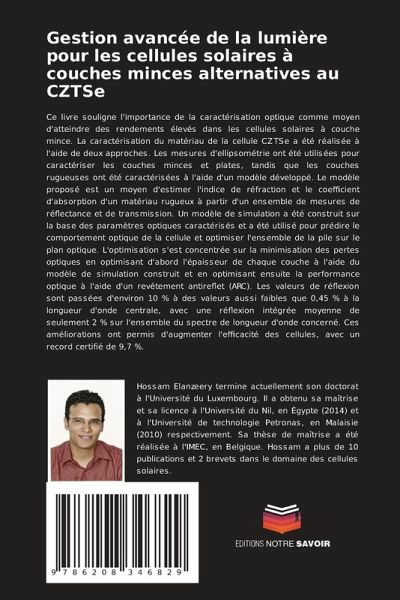 Ce livre souligne l'importance de la caractérisation optique comme moyen d'atteindre des rendements élevés dans les cellules solaires à couche mince. La caractérisation du matériau de la cellule CZTSe a été réalisée à l'aide de deux approches. Les mesures d'ellipsométrie ont été utilisées pour caractériser les couches minces et plates, tandis que les couches rugueuses ont été caractérisées à l'aide d'un modèle développé. Le modèle proposé est un moyen d'estimer l'indice de réfraction et le coefficient d'absorption d'un matériau rugueux à partir d'un ensemble de mesures de réflectance et de transmission. Un modèle de simulation a été construit sur la base des paramètres optiques caractérisés et a été utilisé pour prédire le comportement optique de la cellule et optimiser l'ensemble de la pile sur le plan optique. L'optimisation s'est concentrée sur la minimisation des pertes optiques en optimisant d'abord l'épaisseur de chaque couche à l'aide du modèle de simulation construit et en optimisant ensuite la performance optique à l'aide d'un revêtement antireflet (ARC). Les valeurs de réflexion sont passées d'environ 10 % à des valeurs aussi faibles que 0,45 % à la longueur d'onde centrale, avec une réflexion intégrée moyenne de seulement 2 % sur l'ensemble du spectre de longueur d'onde concerné. Ces améliorations ont permis d'augmenter l'efficacité des cellules, avec un record certifié de 9,7 %.