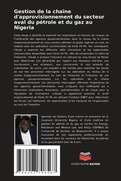 Cette étude a identifié et examiné les implications en termes de risques de l'inefficacité des agences gouvernementales dans le réseau de la chaîne d'approvisionnement du sous-secteur pétrolier et gazier nigérian en aval, en relation avec les opérations commerciales de Forte Oil Plc. Par conséquent, l'étude a examiné les différents défis rencontrés et les opportunités commerciales disponibles pour Forte Oil Plc. Afin de comprendre le cadre de l'industrie, l'étude a analysé l'industrie en utilisant les cinq forces de Porter pour déterminer son attractivité par rapport aux nouveaux entrants, aux fournisseurs, aux acheteurs, aux concurrents et aux produits de substitution. En outre, une enquête a été menée pour examiner les points de vue des personnes interrogées sur les opérations du réseau de la chaîne d'approvisionnement au sein de l'industrie et l'influence de ces agences gouvernementales sur les opérations de la chaîne d'approvisionnement. Les personnes interrogées affirment l'importance de ces agences gouvernementales mais critiquent leur inefficacité qui a d'énormes implications financières, opérationnelles et de risque pour la réputation de l'entreprise. L'étude a également examiné le profil organisationnel de Forte Oil Plc en utilisant l'analyse SWOT pour déterminer les forces, les faiblesses, les opportunités et les menaces de l'organisation au sein de l'industrie.