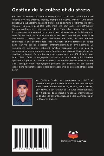 Se sentir en colère fait partie de l'être humain. C'est une réaction naturelle lorsque l'on est attaqué, insulté, trompé ou frustré. Parfois, une colère excessive peut également être le symptôme de certains problèmes de santé mentale. La colère peut être utile, mais elle peut aussi être effrayante. Lorsque quelque chose vous met en colère, l'adrénaline pousse votre corps à se préparer à « combattre ou fuir », ce qui vous donne de l'énergie et vous fait ressentir de la tension et du stress. Le stress fait partie de la vie quotidienne. Lorsque les gens demandent de l'aide, ils sont souvent confrontés à des circonstances, des situations et des facteurs de stress dans leur vie qui les accablent émotionnellement et physiquement. De nombreuses personnes estiment qu'elles disposent de très peu de ressources ou de compétences pour faire face aux niveaux élevés de stress qu'elles subissent. De nombreuses personnes ont des difficultés à gérer leur colère. Cette monographie s'adresse à tous ceux qui souhaitent apprendre à gérer la colère et le stress de manière constructive et saine. C'est pourquoi cette monographie présente des nuances et des canons issus d'une recherche approfondie pour aborder la colère et le stress et les gérer.