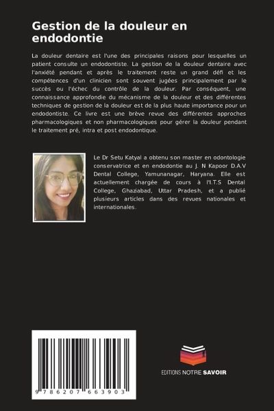 La douleur dentaire est l'une des principales raisons pour lesquelles un patient consulte un endodontiste. La gestion de la douleur dentaire avec l'anxiété pendant et après le traitement reste un grand défi et les compétences d'un clinicien sont souvent jugées principalement par le succès ou l'échec du contrôle de la douleur. Par conséquent, une connaissance approfondie du mécanisme de la douleur et des différentes techniques de gestion de la douleur est de la plus haute importance pour un endodontiste. Ce livre est une brève revue des différentes approches pharmacologiques et non pharmacologiques pour gérer la douleur pendant le traitement pré, intra et post endodontique.