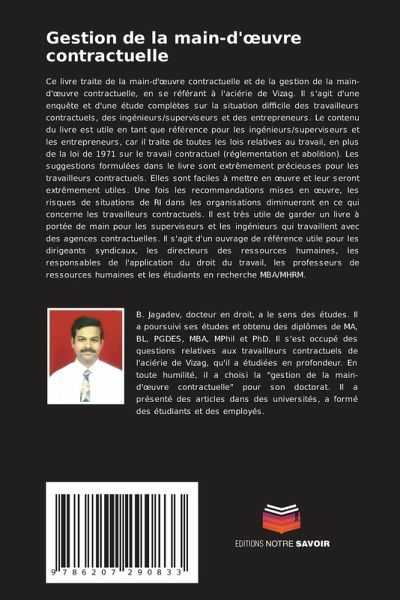 Ce livre traite de la main-d'oeuvre contractuelle et de la gestion de la main-d'oeuvre contractuelle, en se référant à l'aciérie de Vizag. Il s'agit d'une enquête et d'une étude complètes sur la situation difficile des travailleurs contractuels, des ingénieurs/superviseurs et des entrepreneurs. Le contenu du livre est utile en tant que référence pour les ingénieurs/superviseurs et les entrepreneurs, car il traite de toutes les lois relatives au travail, en plus de la loi de 1971 sur le travail contractuel (réglementation et abolition). Les suggestions formulées dans le livre sont extrêmement précieuses pour les travailleurs contractuels. Elles sont faciles à mettre en oeuvre et leur seront extrêmement utiles. Une fois les recommandations mises en oeuvre, les risques de situations de RI dans les organisations diminueront en ce qui concerne les travailleurs contractuels. Il est très utile de garder un livre à portée de main pour les superviseurs et les ingénieurs qui travaillent avec des agences contractuelles. Il s'agit d'un ouvrage de référence utile pour les dirigeants syndicaux, les directeurs des ressources humaines, les responsables de l'application du droit du travail, les professeurs de ressources humaines et les étudiants en recherche MBA/MHRM.