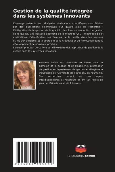 L'ouvrage présente les principales réalisations scientifiques concrétisées par des publications scientifiques sur quatre axes de recherche : L'intégration de la gestion de la qualité ; l'exploration des outils de gestion de la qualité, une nouvelle approche de la méthode QFD - méthodologie et applications, l'identification des facettes de la qualité dans les services d'aide aux étudiants et la poursuite de la créativité et de l'innovation dans le développement de nouveaux produits. L'objectif principal de ce livre est d'introduire des approches de gestion de la qualité dans les systèmes innovants.
