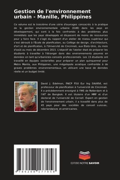 Ce volume est le troisième d'une série d'ouvrages consacrés à la pratique de la gestion environnementale urbaine (GUE) dans les pays en développement, qui sont à la fois confrontés à des problèmes plus immédiats que les pays développés et disposent de moins de ressources pour y faire face. Il s'agit du rapport d'un atelier de niveau supérieur qui s'est déroulé à l'École de planification, au Collège de design, d'architecture, d'art et de planification, à l'Université de Cincinnati, aux États-Unis, du mois d'août au mois de décembre 2015. L'objectif de l'atelier était de préparer les étudiants à travailler à l'étranger dans des environnements pauvres en données en tant qu'urbanistes-conseils professionnels. Les 15 étudiants ont travaillé en équipes sectorielles pour préparer un plan quinquennal pour Metro Manila, aux Philippines, une mégalopole asiatique confrontée à de graves problèmes environnementaux, en utilisant une base de données réelle et un budget limité.