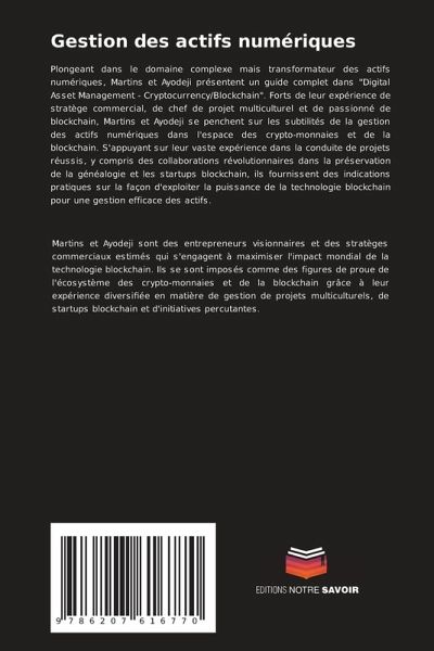 Plongeant dans le domaine complexe mais transformateur des actifs numériques, Martins et Ayodeji présentent un guide complet dans "Digital Asset Management - Cryptocurrency/Blockchain". Forts de leur expérience de stratège commercial, de chef de projet multiculturel et de passionné de blockchain, Martins et Ayodeji se penchent sur les subtilités de la gestion des actifs numériques dans l'espace des crypto-monnaies et de la blockchain. S'appuyant sur leur vaste expérience dans la conduite de projets réussis, y compris des collaborations révolutionnaires dans la préservation de la généalogie et les startups blockchain, ils fournissent des indications pratiques sur la façon d'exploiter la puissance de la technologie blockchain pour une gestion efficace des actifs.