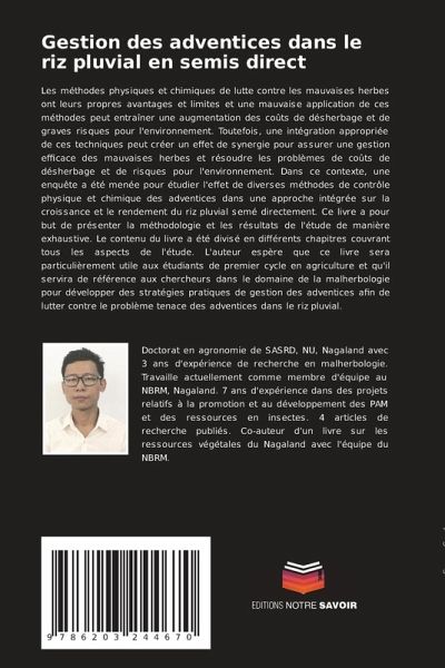 Les méthodes physiques et chimiques de lutte contre les mauvaises herbes ont leurs propres avantages et limites et une mauvaise application de ces méthodes peut entraîner une augmentation des coûts de désherbage et de graves risques pour l'environnement. Toutefois, une intégration appropriée de ces techniques peut créer un effet de synergie pour assurer une gestion efficace des mauvaises herbes et résoudre les problèmes de coûts de désherbage et de risques pour l'environnement. Dans ce contexte, une enquête a été menée pour étudier l'effet de diverses méthodes de contrôle physique et chimique des adventices dans une approche intégrée sur la croissance et le rendement du riz pluvial semé directement. Ce livre a pour but de présenter la méthodologie et les résultats de l'étude de manière exhaustive. Le contenu du livre a été divisé en différents chapitres couvrant tous les aspects de l'étude. L'auteur espère que ce livre sera particulièrement utile aux étudiants de premier cycle en agriculture et qu'il servira de référence aux chercheurs dans le domaine de la malherbologie pour développer des stratégies pratiques de gestion des adventices afin de lutter contre le problème tenace des adventices dans le riz pluvial.