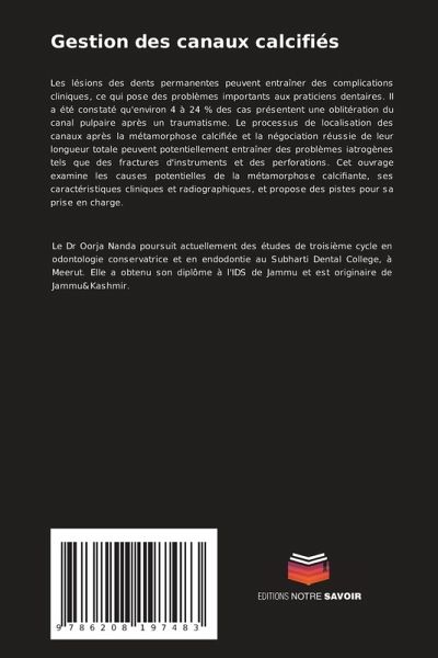 Les lésions des dents permanentes peuvent entraîner des complications cliniques, ce qui pose des problèmes importants aux praticiens dentaires. Il a été constaté qu'environ 4 à 24 % des cas présentent une oblitération du canal pulpaire après un traumatisme. Le processus de localisation des canaux après la métamorphose calcifiée et la négociation réussie de leur longueur totale peuvent potentiellement entraîner des problèmes iatrogènes tels que des fractures d'instruments et des perforations. Cet ouvrage examine les causes potentielles de la métamorphose calcifiante, ses caractéristiques cliniques et radiographiques, et propose des pistes pour sa prise en charge.