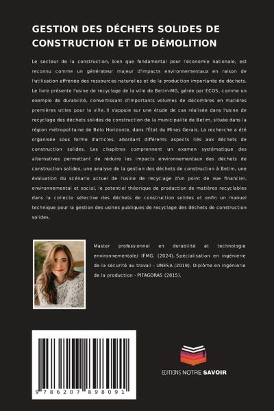 Le secteur de la construction, bien que fondamental pour l'économie nationale, est reconnu comme un générateur majeur d'impacts environnementaux en raison de l'utilisation effrénée des ressources naturelles et de la production importante de déchets. Le livre présente l'usine de recyclage de la ville de Betim-MG, gérée par ECOS, comme un exemple de durabilité, convertissant d'importants volumes de décombres en matières premières utiles pour la ville. Il s'appuie sur une étude de cas réalisée dans l'usine de recyclage des déchets solides de construction de la municipalité de Betim, située dans la région métropolitaine de Belo Horizonte, dans l'État du Minas Gerais. La recherche a été organisée sous forme d'articles, abordant différents aspects liés aux déchets de construction solides. Les chapitres comprennent un examen systématique des alternatives permettant de réduire les impacts environnementaux des déchets de construction solides, une analyse de la gestion des déchets de construction à Betim, une évaluation du scénario actuel de l'usine de recyclage d'un point de vue financier, environnemental et social, le potentiel théorique de production de matières recyclables dans la collecte sélective des déchets de construction solides et enfin un manuel technique pour la gestion des usines publiques de recyclage des déchets de construction solides.